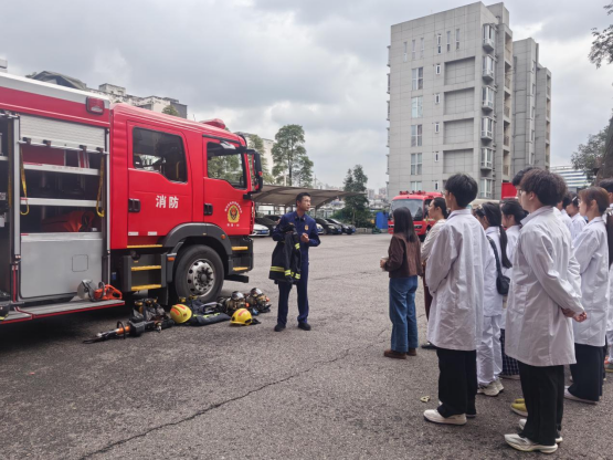 消防指战员结合近年来典型火灾案例,向师生党员详细讲解火灾成因、初期火灾扑救方法、火场逃生技巧及消防器材正确使用规范,强化师生消防安全意识。理论讲解后,指战员带领师生党员近距离参观消防车及各类消防救援装备,逐一介绍设备用途与操作流程,并邀请学生亲身体验消防作战服穿戴。通过直观感受消防装备的重量与特殊性,师生进一步体会到消防指战员日常训练与执行任务的艰辛,深化了对消防职业的敬畏之心。