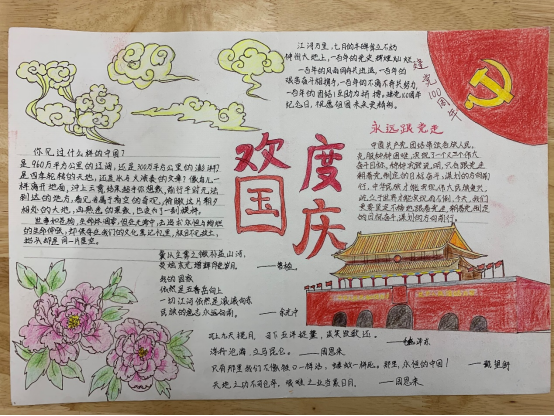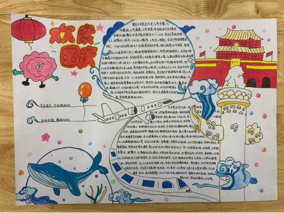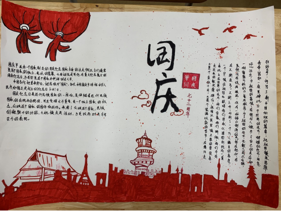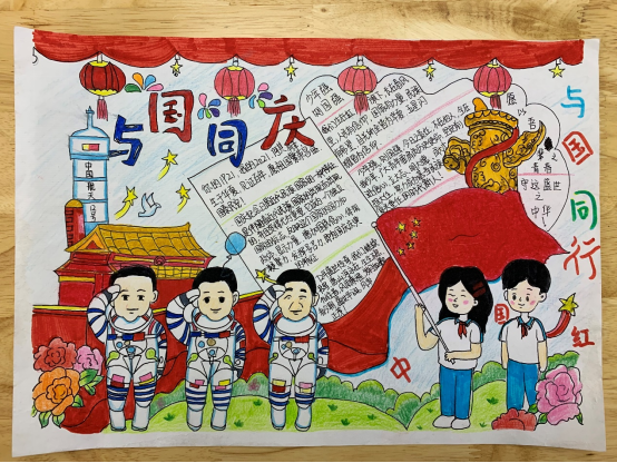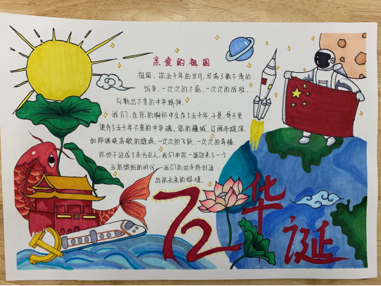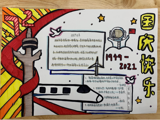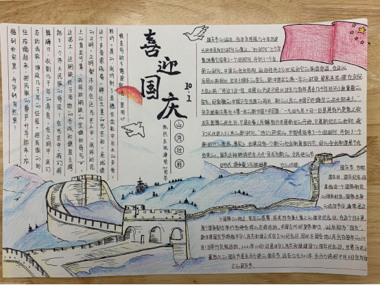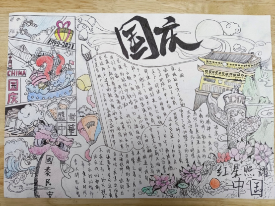 春生夏长,秋收冬藏,又来到了一年一度的金秋十月,为迎接和庆祝祖国第72个生日,新媒体中心于2021年9月28日举办以“色彩晕染、欢度国庆”为主题的手抄报比赛在我校康复系如火如茶地展开。今天让我们共同从绘画中吸取养分以唤起那红色的记忆,鲜艳的五星红旗、雄伟的天安门、飞向四方的和平鸽、巍峨的万里长城,深深印在每一位中华儿女的心中。他们用画笔表达着对祖国深深的爱意,他们热爱美丽的祖国,也必将在祖国强大、幸福的怀抱中茁壮成长!