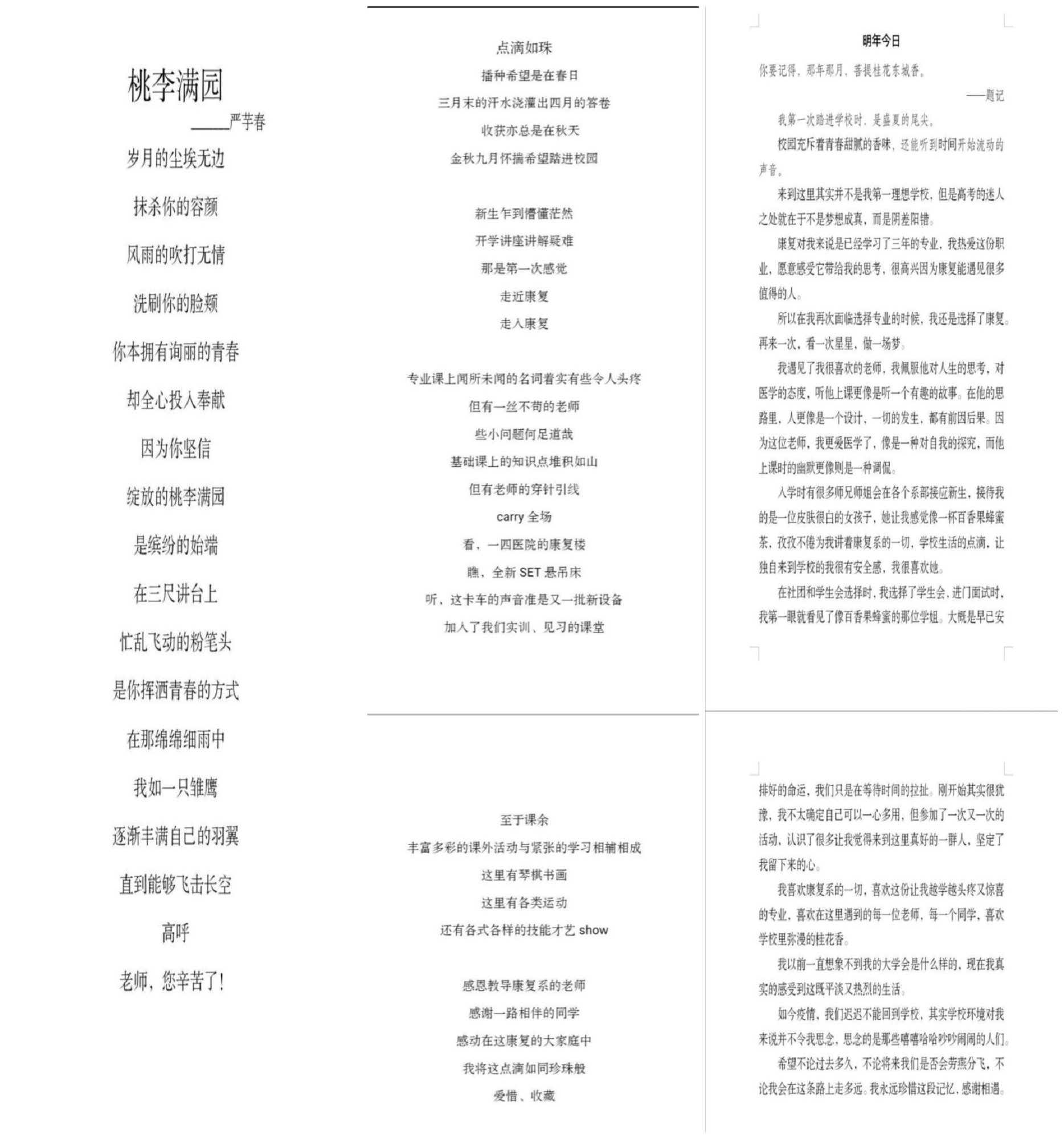 康复系的温暖,在于老师们“桃李不言,下自成蹊”的默默奉献,也在于同学间“海内存知己,天涯若比邻”的默契相知!经年之后,容颜或会苍老,但文字可历久弥新。最后,让我们一起来颂读这些包含深情的短文诗。