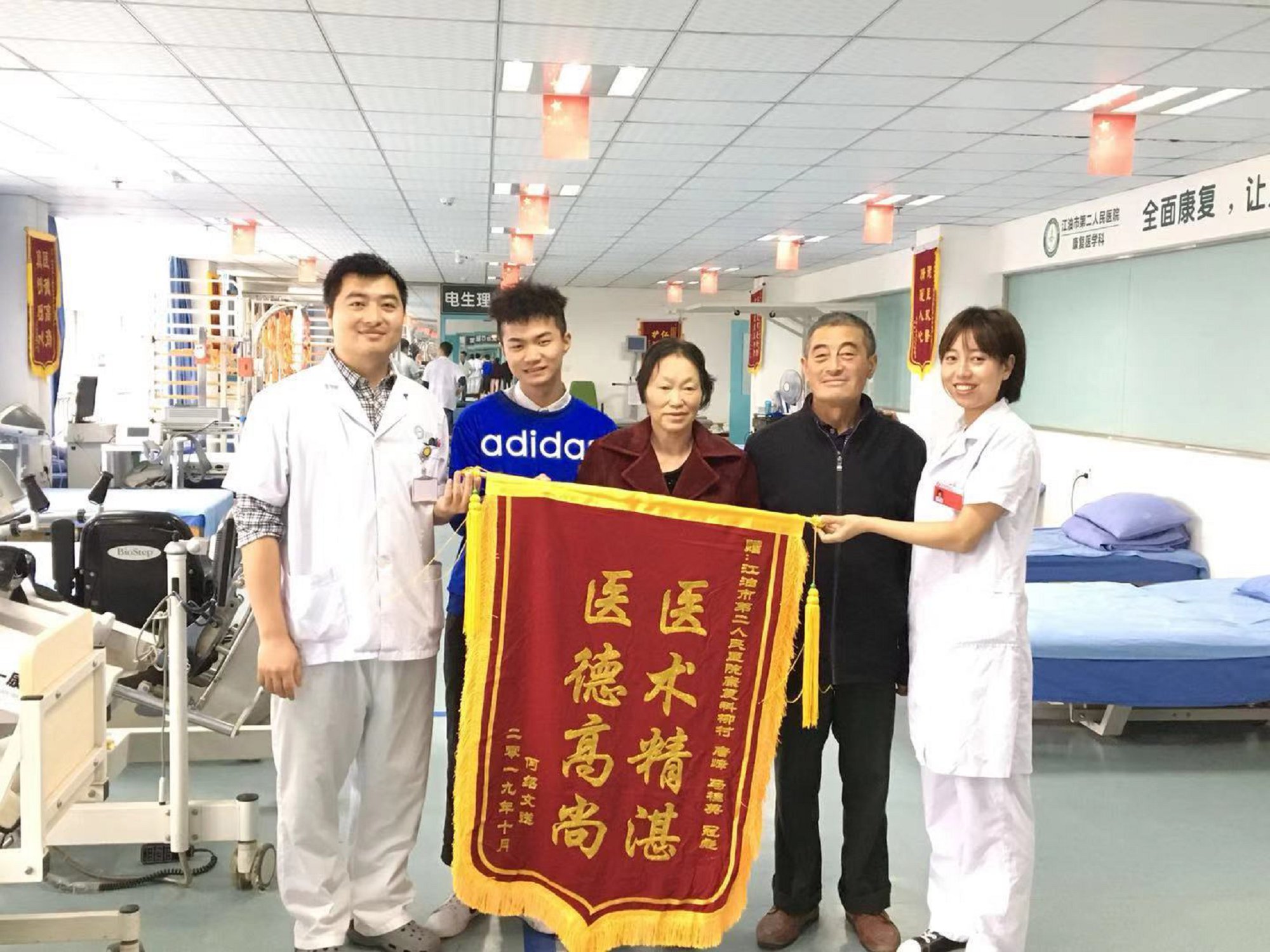2019年10月19日,我校在江油市第二人民医院康复科——神经康复组实习的康复治疗技术专业同学柳村,收到了他职业生涯的第一份荣誉,一面来自于患者的锦旗。