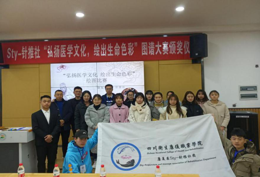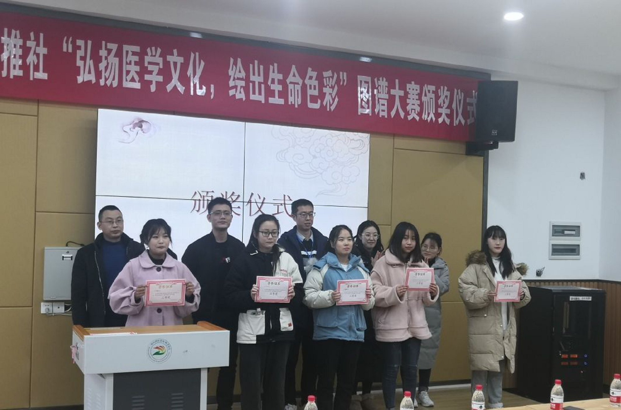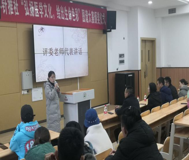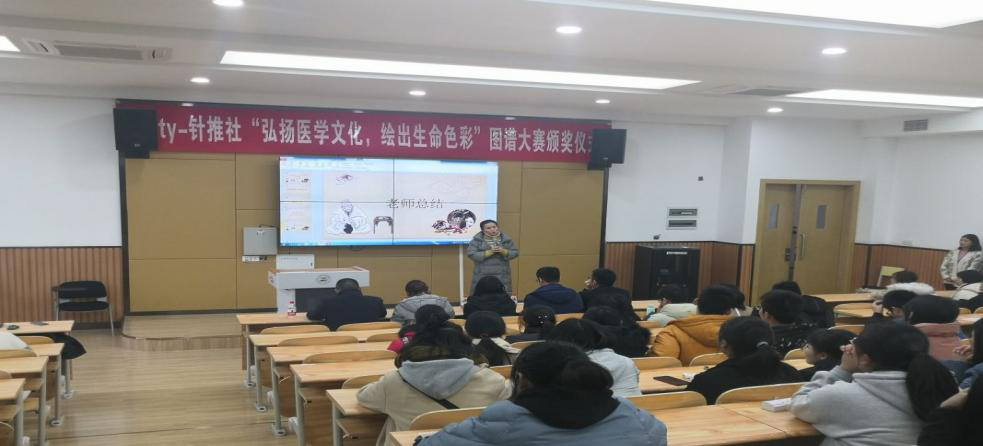为了激发学生的美术兴趣与爱好,丰富学生课余生活,提高学生艺术欣赏和艺术创作能力,绘出自己心中的医学文化。Sty-针推社面向全校同学举办了“弘扬医学文化,绘出生命色彩”图谱比赛,并于2019年12月18日在学院一教B303举行了此次比赛的颁奖典礼。康复系单正根、赵玉霞、沈丽、卫琛、李雪微、牟杨六位老师以及180余名同学参加典礼。