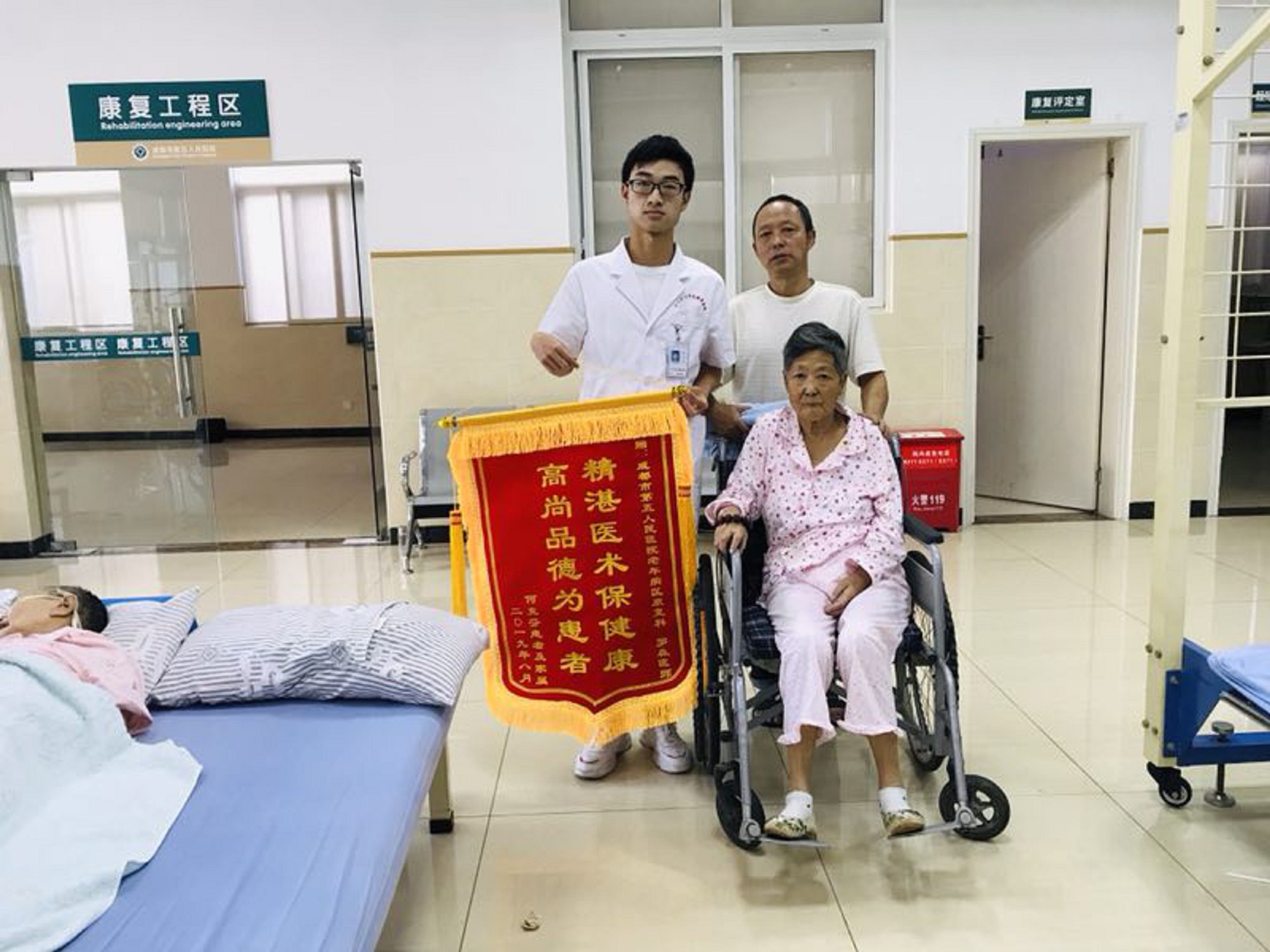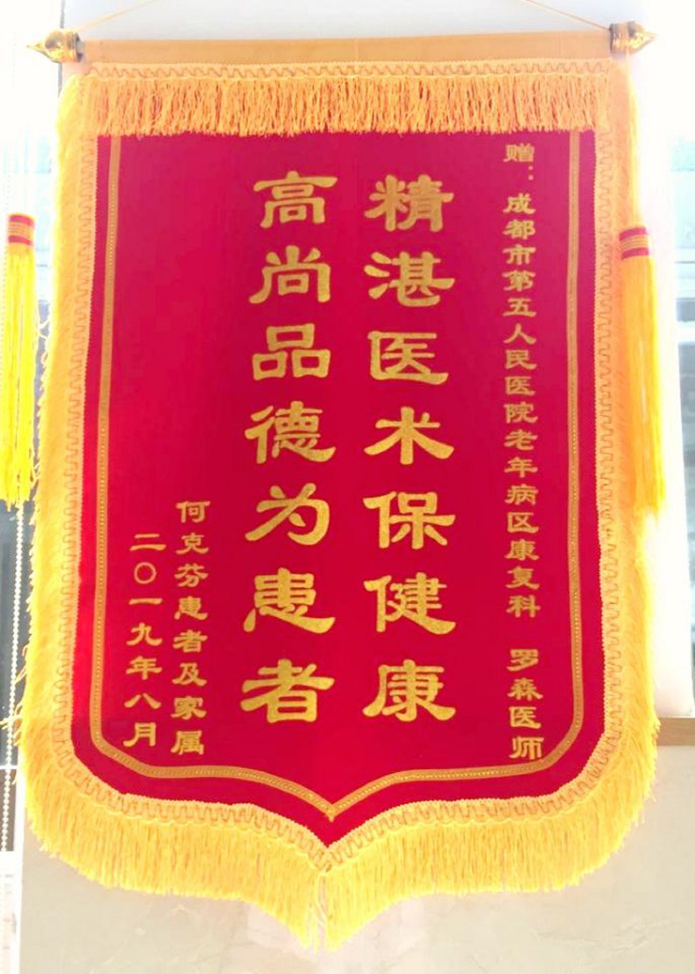 2019年8月12日,在成都市第五人民医院康复科运动治疗室内上演了温馨的一幕,76岁的脑梗患者和家属,将一面写有“精湛医术保健康,高尚医德为患者”的锦旗递交到了实习医生罗森的手里。