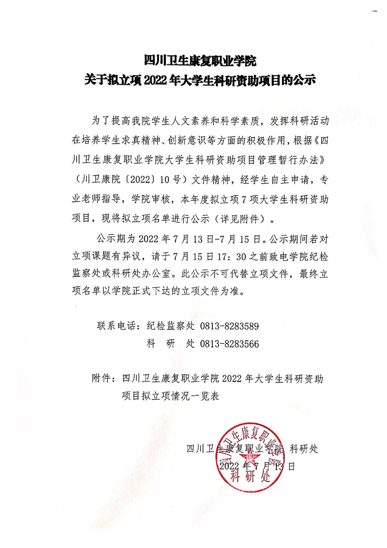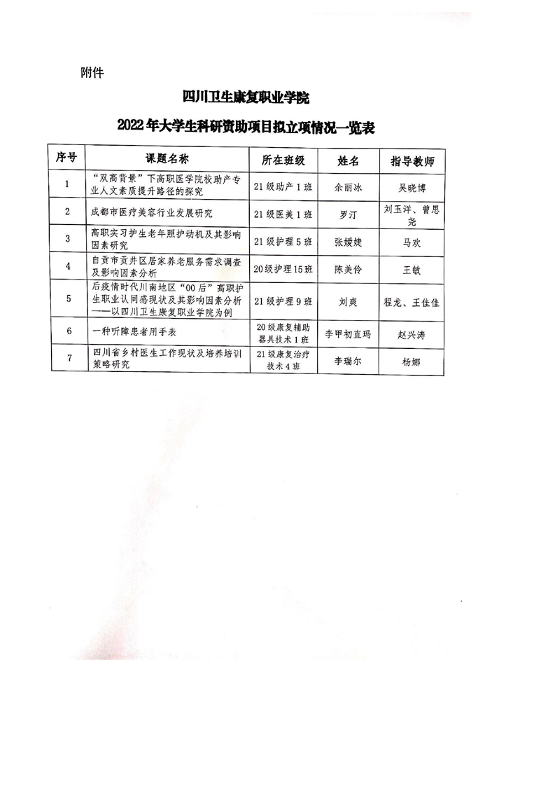 【公示】四川卫生康复职业学院关于拟立项2022年大学生科研资助项目的公示