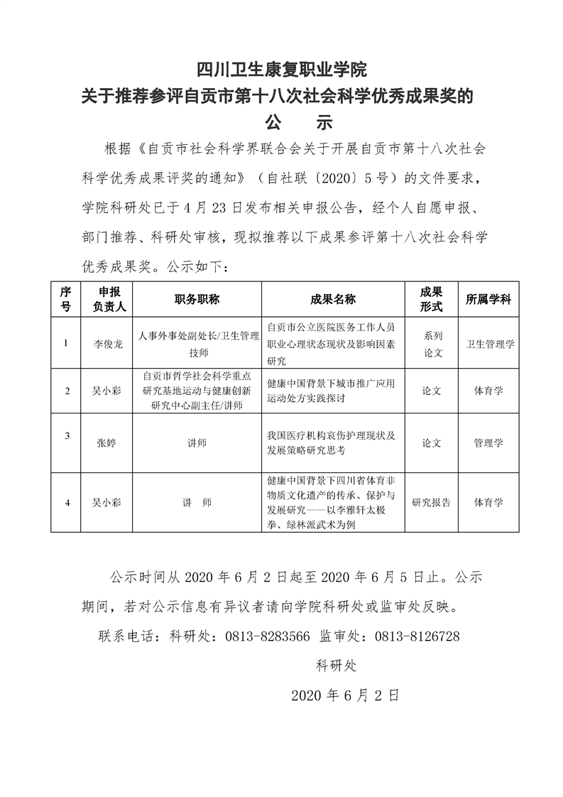 四川卫生康复职业学院关于推荐参评自贡市第十八次社会科学优秀成果奖的公示