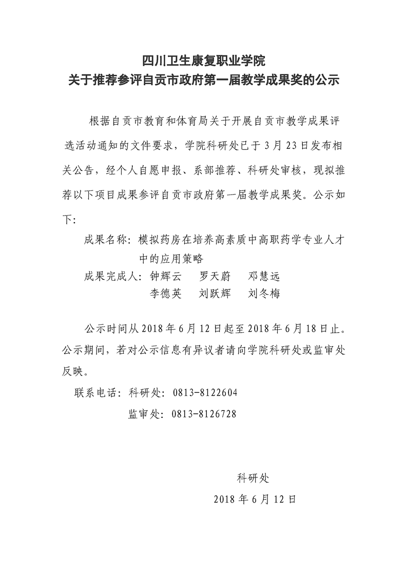 四川卫生康复职业学院关于推荐参评自贡市政府第一届教学成果奖的公示