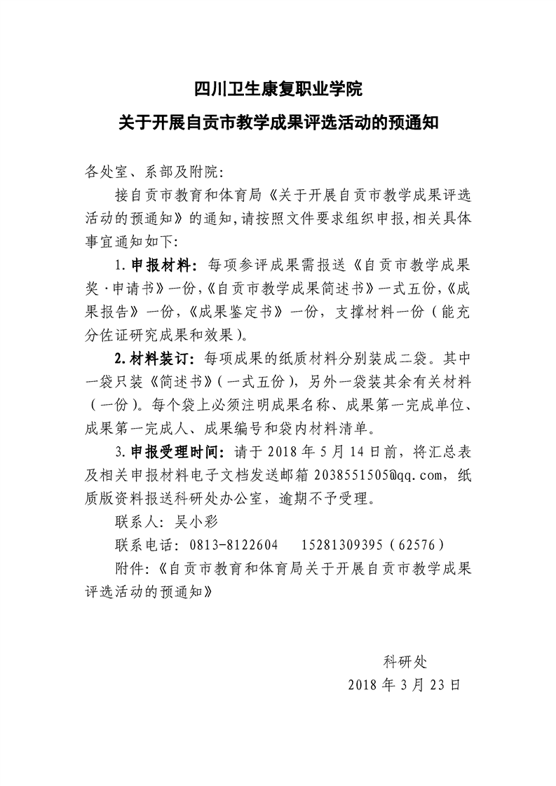四川卫生康复职业学院关于开展自贡市教学成果评选活动的预通知