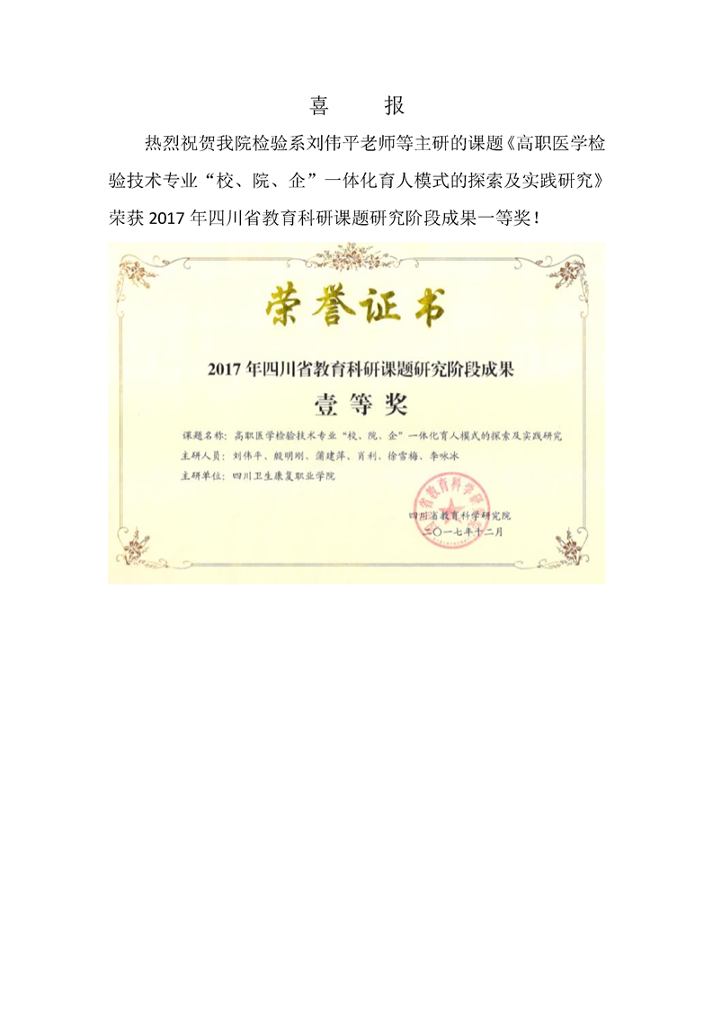 我院科研课题喜获2017年四川省教育科研课题研究阶段成果一等奖