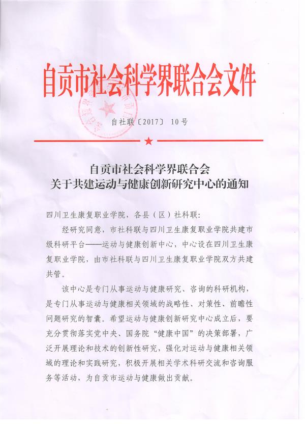 运动与健康创新研究中心由自贡市社科联与四川卫生康复职业学院双方共建共管,中心挂靠学院科研处,由人文社科部负责具体运行与管理。该中心是专门从事运动与健康相关领域的战略性、对策性、前瞻性问题研究的智囊,研究中心将通过共建平台、联合攻关等方式,合力推动体育和医学多维度、深层次的融合。通过加强体医融合推动非医疗健康干预方法、路径的研究与实践,促进全民健身与全民健康深度融合;开展体育与医学融合相关政策、理论和技术的创新性研究,围绕运动康复专业人才培养、体育健康医疗产业、运动损伤与防护、运动干预、慢性疾病与急性损伤的运动康复等运动与大健康产业的前沿问题进行入研讨,加强成果转化,进行模式示范,为竞技体育、大众健身运动提供研究与咨询服务,推动体育产业与健康产业对接。
