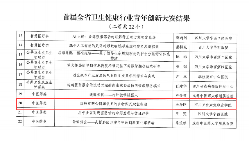 近日,四川省卫生健康委员会公布了首届全省卫生健康行业青年创新大赛获奖名单。我校教师马泽刚的参赛项目《绞股蓝药食同源饮品的乡村振兴赋能实践》获大赛二等奖、中医药赛道第四名。该项目聚焦绞股蓝等中药材活性成分的系统研究,研制了系列绞股蓝健康饮品,致力于推动药食同源资源的高值化利用,以科技创新助力乡村振兴。