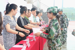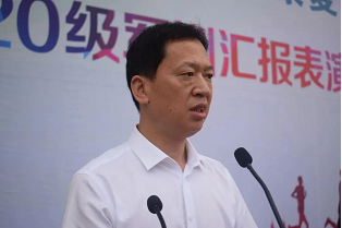 自贡市沿滩区人民武装部政委向辉讲话,就军训表演成果做出总结并对同学们发出勉励,并且向同学们倡议光荣参军。