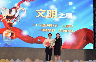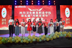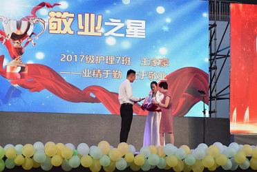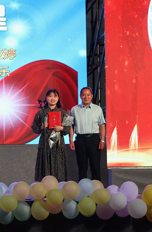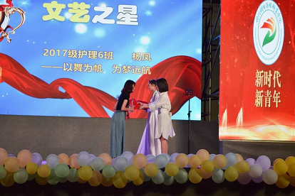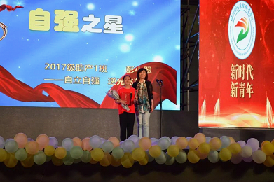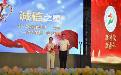 高职影像8班的学姐、首届川康星青年获得者金欣为文艺之星杨凤颁奖。