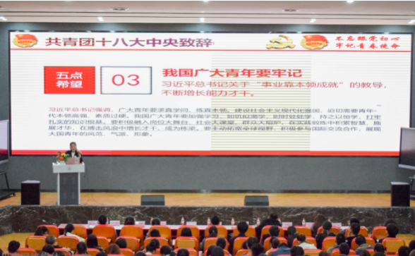 活动开始,全体起立共唱团歌,展现各学生干部朝气蓬勃的精神风貌。随后校团委副书记王庆老师讲话,此次发言此次团课从团十八大概况、党中央对大会致词主精神、团十八大报告为主要内容进行解读。课上明确了团十八大是党的十九大后群团组织召开的第一个全国代表大会,是中国特色社会主义进入新时代背景下的青年盛会,是全国团员青年政治生活中的一件大事。同时,强调了广大团员青年要把思想统一到团的十八大精神上来,把力量凝聚到实现团的十八大确定的各项任务上来,以习近平新时代中国特色社会主义思想特别是关于青年工作的重要思想为指导,提高团员担当力。共同回顾过去的功绩,总结不足。明确新青年的使命,做有理想、有本领、有担当的新青年。本校在七个改革中着重深化青联、学联改革。