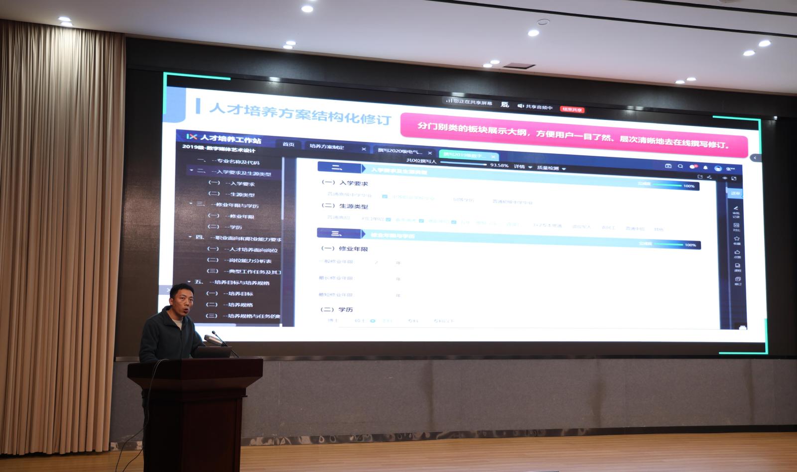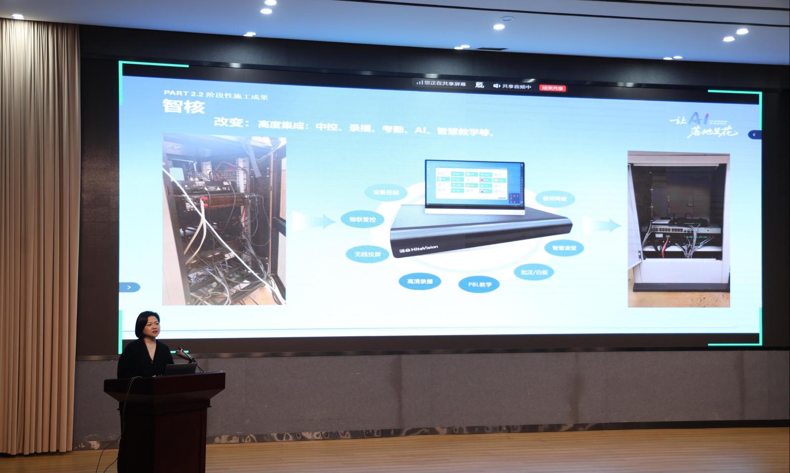 两位教师围绕两个项目开展展示汇报工作。智慧教室建设项目落成后,将解决原有设备故障频发、操作繁杂等难题,搭建涵盖线上评课、直播等内容的个性化服务体系,为教学、学生服务及设备管理带来便利。一体化平台建成后,将整合学校多平台与资源,消除资源“孤岛”现象,实现人才培养结构化等自动化功能,搭建10余个数据看板,为教学管理“减负增效”。