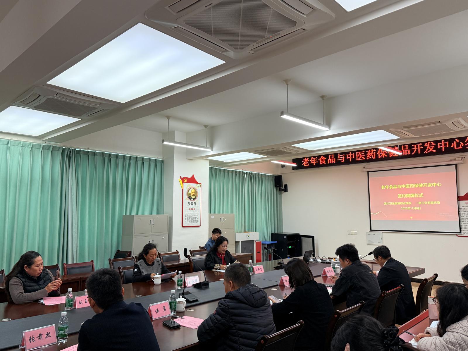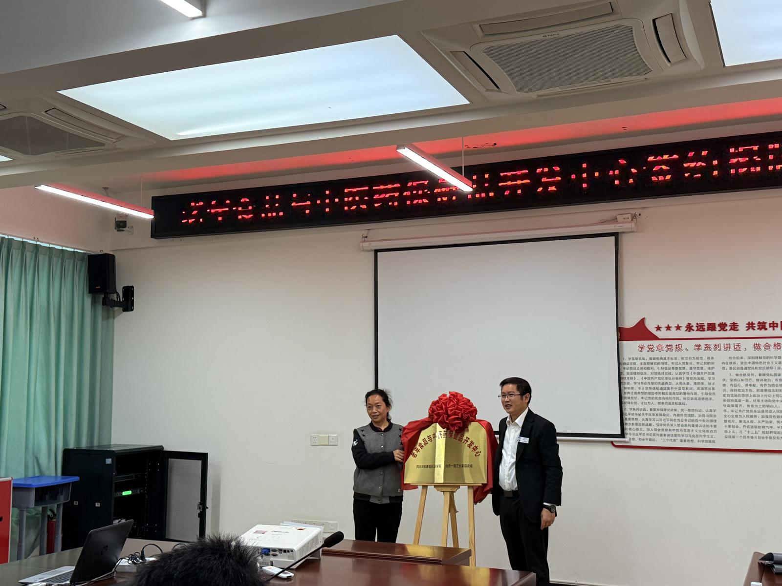 11月6日下午,学校与自贡一亩三分家庭农场共建的老年食品与中医药保健品开发中心签约揭牌仪式在2-A514举行。自贡一亩三分家庭农场负责人王晓辉一行,学校副校长李琴及相关部门负责人参加。