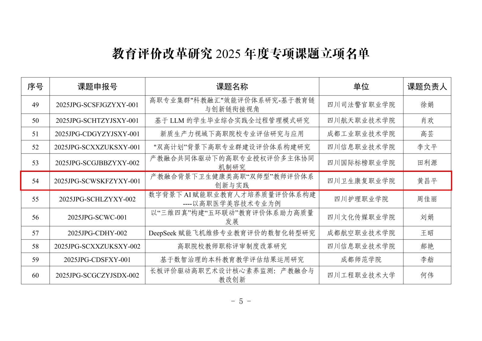 经四川省教育厅严格评审,我校申报的《产教融合背景下卫生健康类高职“双师型”教师评价体系创新与实践》课题,成功立项为2025年度四川省教育评价改革研究专项课题。该课题的立项,不仅是对学校教育评价改革研究能力的充分认可,更将为学校进一步推动教育评价实践创新、优化人才培养质量、提升整体办学水平提供强有力的理论支撑与实践指引。
