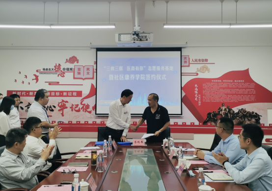9月26日,“三救三献,医路有你”志愿服务基地暨社区康养学院签约仪式在我院成功举行,学院院长黄昌平、自贡市高新区党群工作部副部长兰曦、自贡市高新区学苑街道党工委书记黄星雨、自贡市红十字会办公室主任朱海宁、自贡市高新区学苑街道党工委副书记吕超、自贡市沿滩区九洪乡卫生院院长魏英、自贡市高新区学苑街社区卫生服务中心主任刘铁坚、临床医技学院、康复学院、护理学院相关负责人出席本次活动。