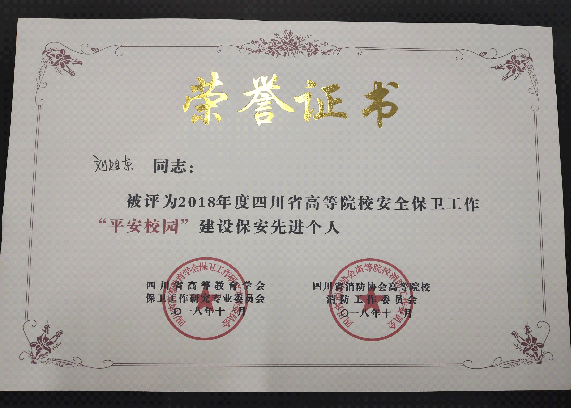 此外,翁强同志被评为2018年度四川省高等院校安全保卫工作“平安校园”建设保卫干部先进个人,刘旭东同志被评为2018年度四川省高等院校安全保卫工作“平安校园”建设保安先进个人,田姜、王洁同学被评为2018年度四川省高等院校安全保卫工作“平安校园”建设学生先进个人。
