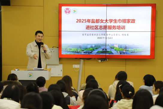活动第一阶段为盐都女大学生巾帼家政进社区志愿服务队启动仪式暨培训会,自贡益启爱社会工作服务中心负责人胡缘勇出席活动。启动仪式上,学生科科长李静介绍了护理学院志愿服务工作开展情况及成效;胡缘勇解读了服务队组建背景、服务宗旨与发展规划;护理学院副院长陈旭致辞表示,服务队为女大学生搭建了实践锻炼与社会服务双重平台,鼓励同学们以专业素养践行志愿服务精神,并现场为服务队授予专属志愿者马甲。启动仪式后,胡缘勇围绕志愿者队伍组织管理、职责分工、家政服务核心内容、沟通技巧及服务安全等开展专题培训,让女大学生直观了解行业发展现状与社会价值。