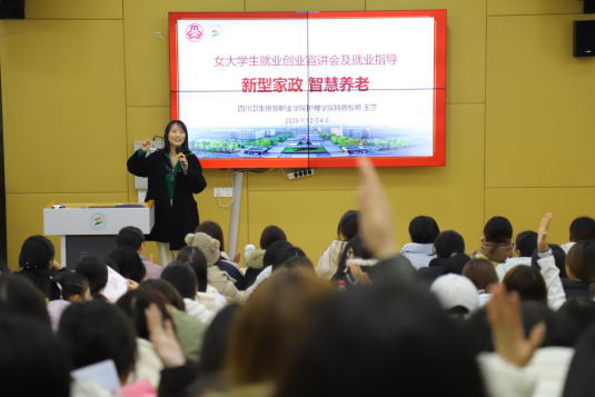 为促进女性人才与岗位精准对接,满足高校女大学生成长发展需求,提升其就业创业能力,近日,“巾帼护航 职引未来——2025年四川省女大学生创业就业指导服务走进四川卫生康复职业学院活动”成功举办。本次活动由四川省妇女联合会主办,自贡市妇女联合会、四川卫生康复职业学院承办,护理学院具体实施,通过志愿服务队启动培训、主题宣讲、实操指导等环节,为180余名护理、家政、老保专业的女大学生送上就业创业“赋能盛宴”。