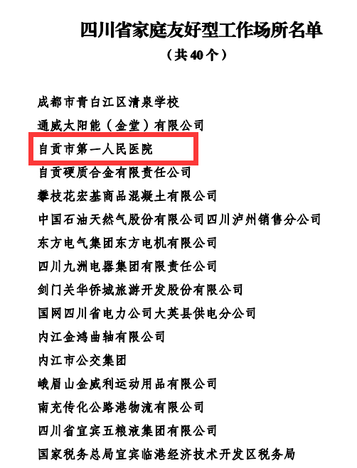 为贯彻男女平等基本国策,推动构建和谐劳动关系高质量发展,根据四川省总工会、四川省人力资源和社会保障厅、四川省卫生健康委员会《关于开展寻找“四川省家庭友好型工作场所”活动的通知》精神,自贡市第一人民医院结合工作实际,深入开展各项活动,积极采取有利于职工平衡工作和家庭关系的措施,不断提升职工获得感、幸福感、安全感,构建和谐稳定的劳动关系,医院被四川省总工会、四川省人社厅、四川省卫健委表扬为“四川省家庭友好型工作场所”。