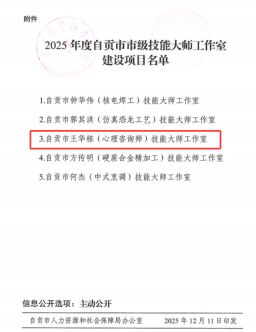 近日,中共自贡市委组织部、自贡市人力资源和社会保障局等5部门公布的2025年度自贡市市级技能大师工作室建设名单,我校王华栋(心理咨询师)技能大师工作室成功获批立项,成为今年全市仅有的5个市级技能大师工作室之一。此次立项是对我校心理健康教育工作的高度认可,彰显了我校在该领域的专业实力与行业影响力。