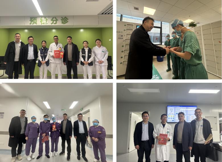 “大家辛苦了!给大家拜年了!”慰问现场暖意融融,院领导班子一行先后走进急诊科、重症医学科、手术室、各门诊、住院病房,与值班职工亲切握手、热忱交流,送上精心准备的慰问品和新春祝福。每到一处,院领导都详细询问春节期间患者收治、医疗安全、物资储备和应急保障情况,对大家 “舍小家、顾大家”的无私奉献精神致以崇高敬意和衷心感谢。