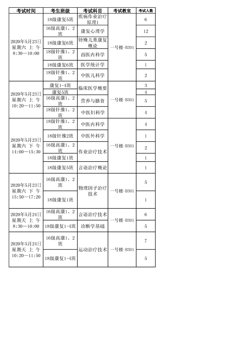 四川卫生康复职业学院2019-2020(1)学期补考安排表