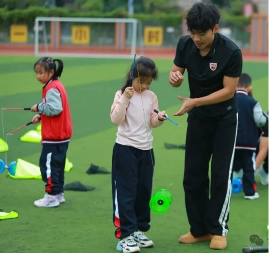 活动现场,我院师生充分发挥专业优势,通过“理论讲解+实操演示”相结合的方式,向孩子们系统介绍了空竹的历史沿革、文化内涵与健身价值。教学环节中,团队成员耐心细致、手把手指导孩子们学习空竹的基本操控技巧,分解每一个动作要领,确保大家听得懂、学得会、做得对。在专业引导下,孩子们迅速掌握了基础动作,操场上空竹嗡鸣、笑声阵阵,传统体育的活力与趣味在校园中生动绽放。