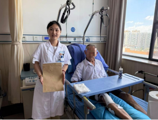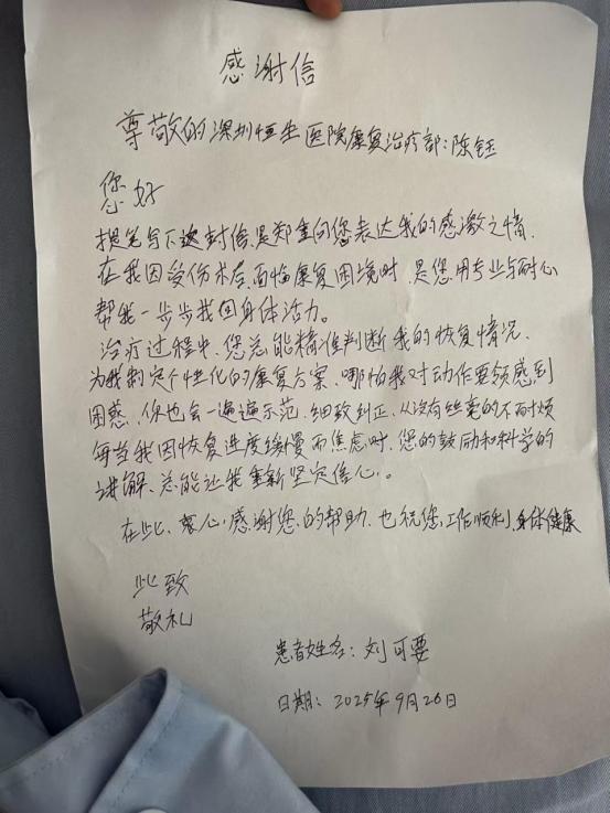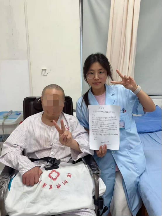 2025 年 8 月 28 日是杨荒显实习生涯难忘的一天。患者叶东平先生出院时,将感谢信交给他。叶先生因脑出血入院时卧床、右侧肢体不能动,杨荒显在带教老师指导下参与其康复训练,见证他从自主站起到搀扶行走。叶先生致谢 “谢谢你让我相信还能站起来”,这让杨荒显懂了康复需技术更需温暖,也激励他成有温度、有担当的医者。