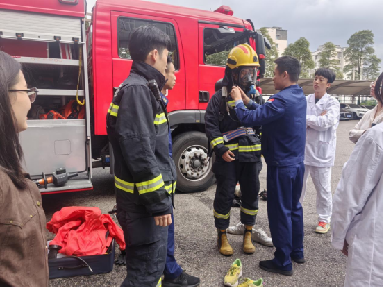 消防指战员结合近年来典型火灾案例,向师生党员详细讲解火灾成因、初期火灾扑救方法、火场逃生技巧及消防器材正确使用规范,强化师生消防安全意识。理论讲解后,指战员带领师生党员近距离参观消防车及各类消防救援装备,逐一介绍设备用途与操作流程,并邀请学生亲身体验消防作战服穿戴。通过直观感受消防装备的重量与特殊性,师生进一步体会到消防指战员日常训练与执行任务的艰辛,深化了对消防职业的敬畏之心。
