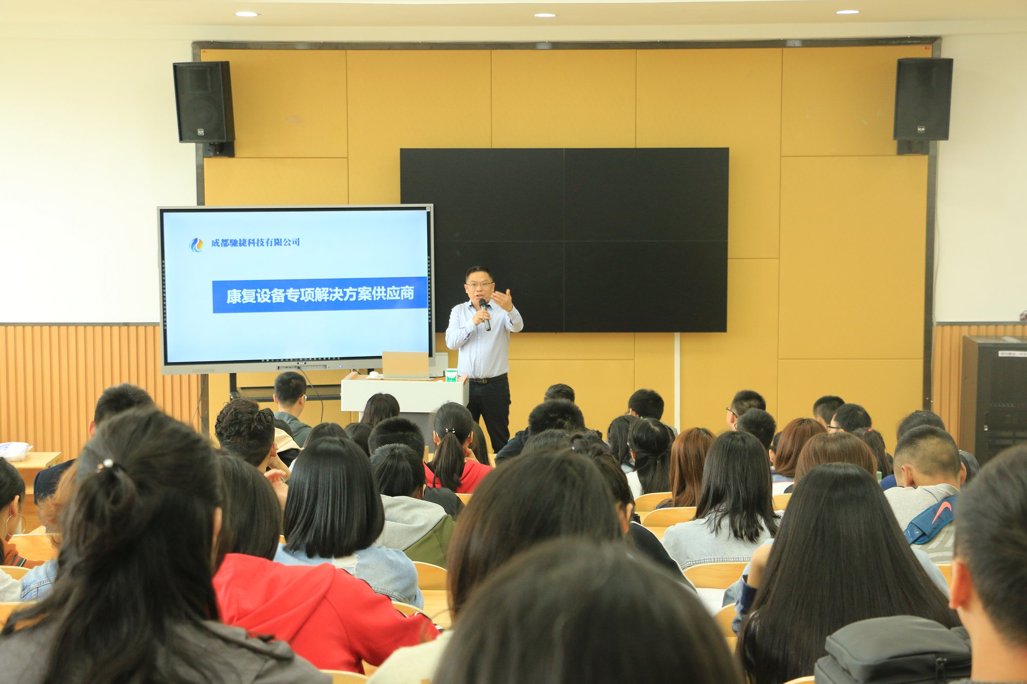 招聘会现场,我们诚挚邀请到成都华唯科技股份有限公司、四川维高科技有限责任公司、成都驰捷科技有限公司、成都康彩科技发展有限公司四家企业到校开展康复专业专场招聘会,为解答同学们心中的疑惑,企业相关负责人纷纷到现场进行企业及岗位需求介绍。