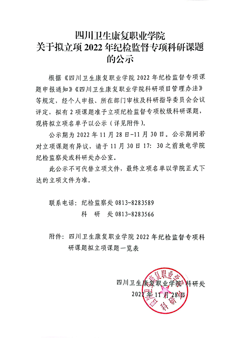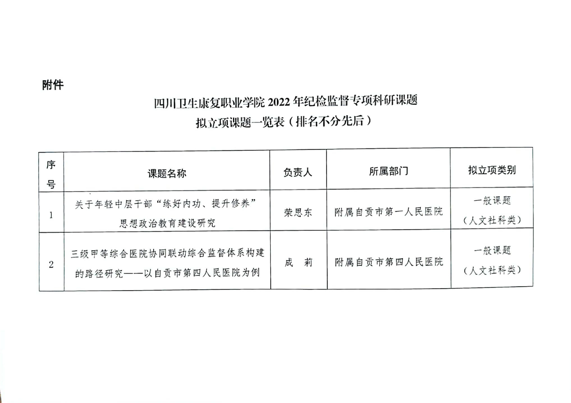 【公示】四川卫生康复职业学院关于拟立项2022年纪检监督专项科研课题的公示