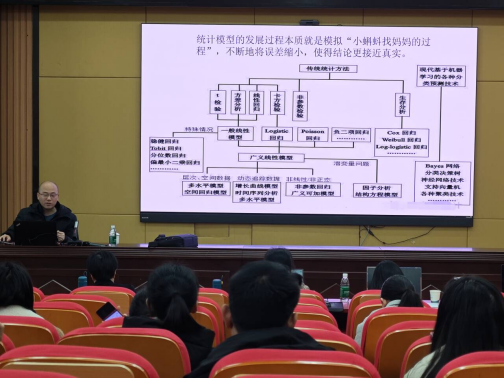 讲座中,杨教授以生动形象的“小蝌蚪找妈妈”为喻,深刻阐释了统计模型的发展本质——即通过不断缩小误差,让分析结论更接近数据真实情况。他系统梳理了统计分析方法的演进脉络,从传统统计方法中的方差分析、线性回归、卡方检验、生存分析等基础技术,到针对特殊情况的稳健回归、分位数回归、Tobit回归等专用模型,再到适用于层次空间数据、动态追踪数据的空间回归模型、多水平模型、时间序列分析等进阶方法,全面覆盖了不同数据场景下的统计解决方案。此外,杨教授还介绍了现代基于机器学习的分类预测技术,为老师们展现了统计分析从传统到现代的完整体系与应用场景。