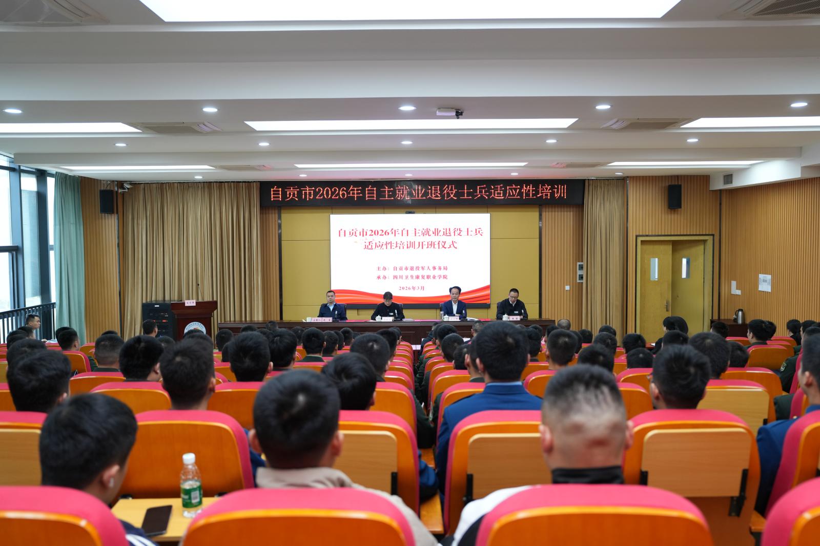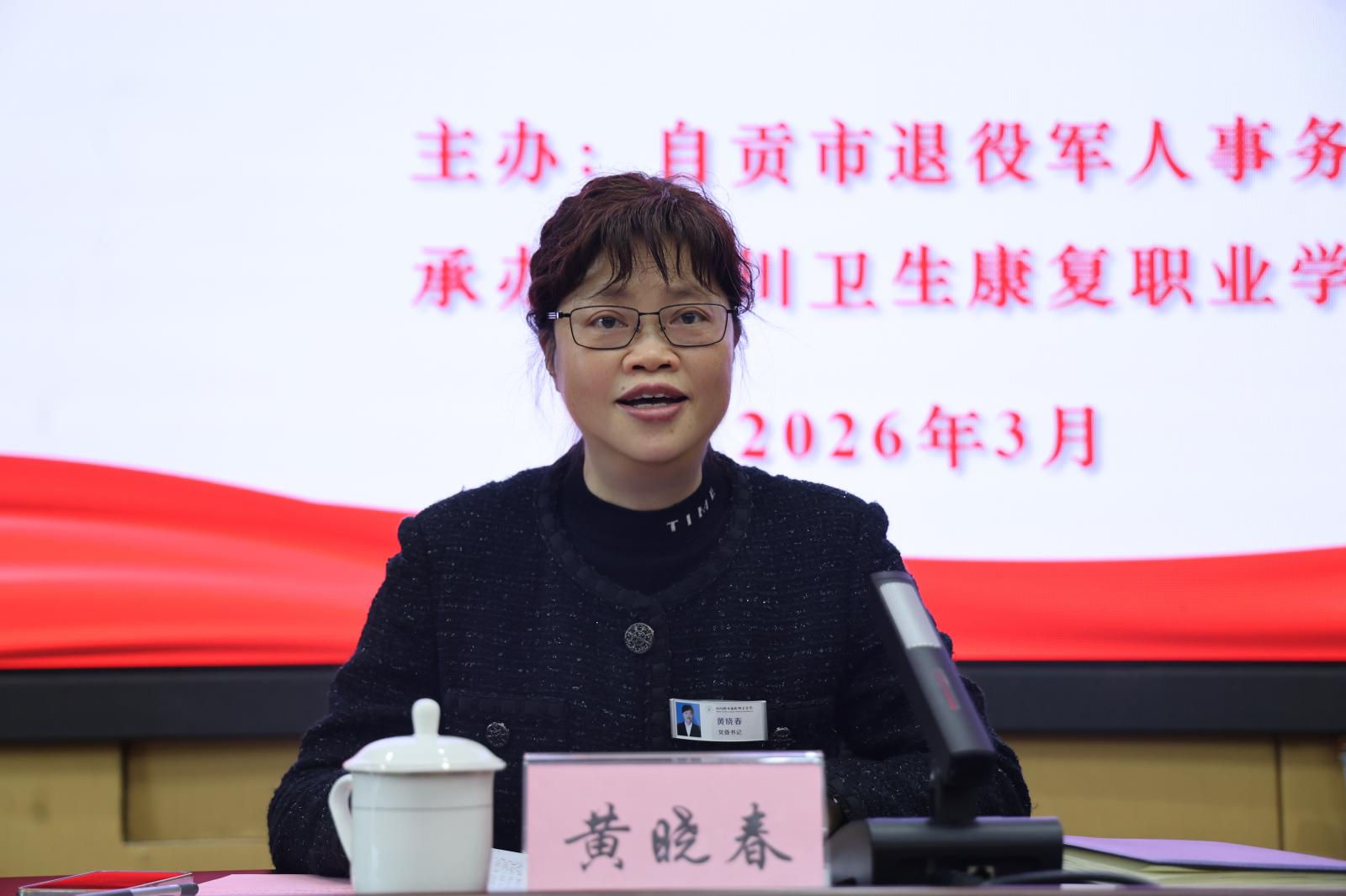 自贡市退役军人事务局党组成员、副局长毛睿,四川卫生康复职业党委委员、副院长熊骥,自流井区、贡井区、大安区、沿滩区、荣县退役军人事务局和高新区社管局主要负责同志,自贡市退役军人事务局、我校有关同志,以及2026年全市120余名春季返乡自主就业退役士兵参会。