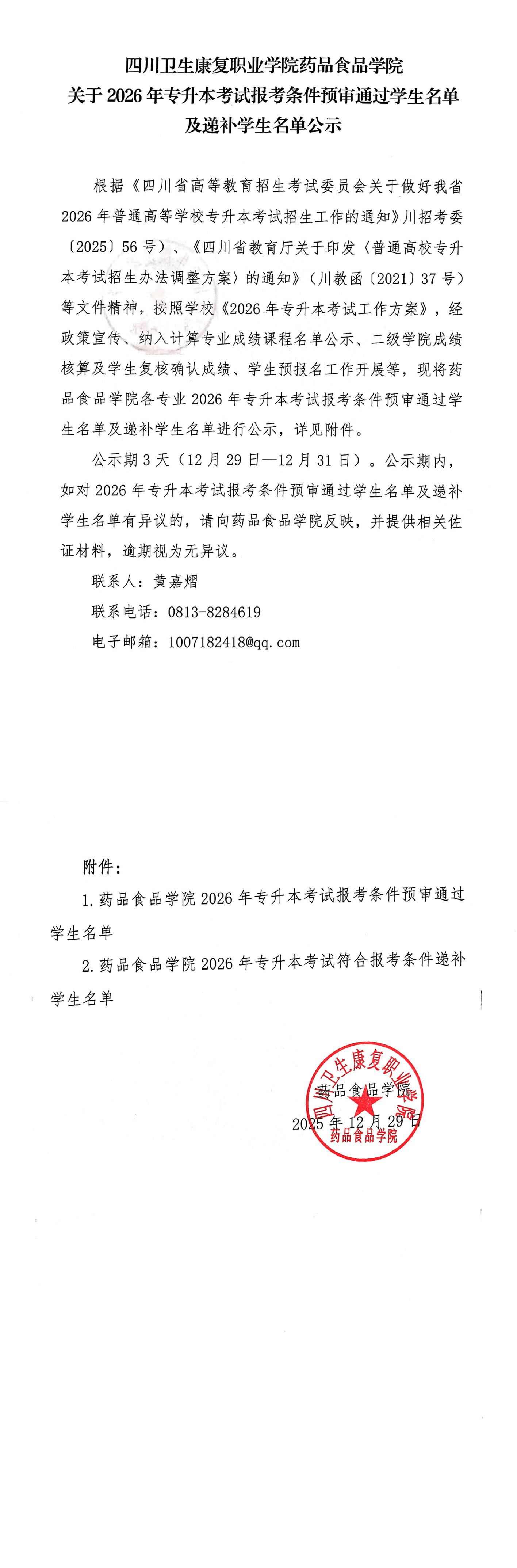 四川卫生康复职业学院药品食品学院关于2026年专升本考试报考条件预审通过学生名单及递补学生名单公示