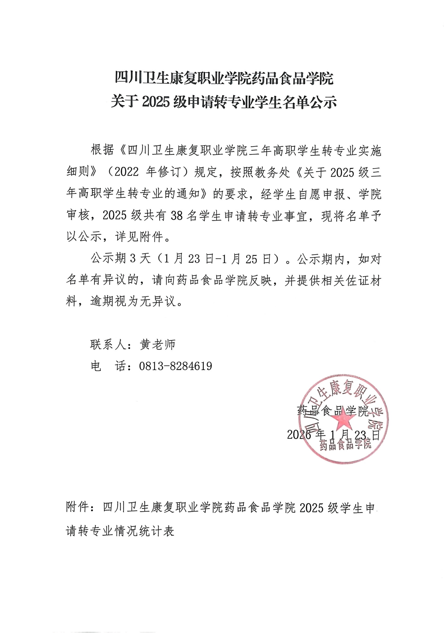 四川卫生康复职业学院药品食品学院关于2025级申请转专业学生名单公示